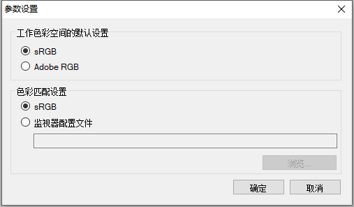 2、弹出参数设置页面,选择工作色彩空间的默认设置和色彩匹配设置。