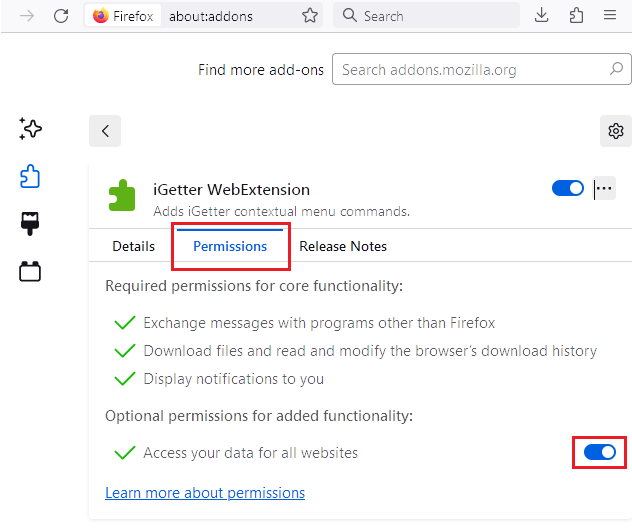 3、火狐浏览器用户需要通过 Firefox 的附加组件管理器 (Ctrl+Shift+A) 中验证是否启用了 iGetter 扩展。