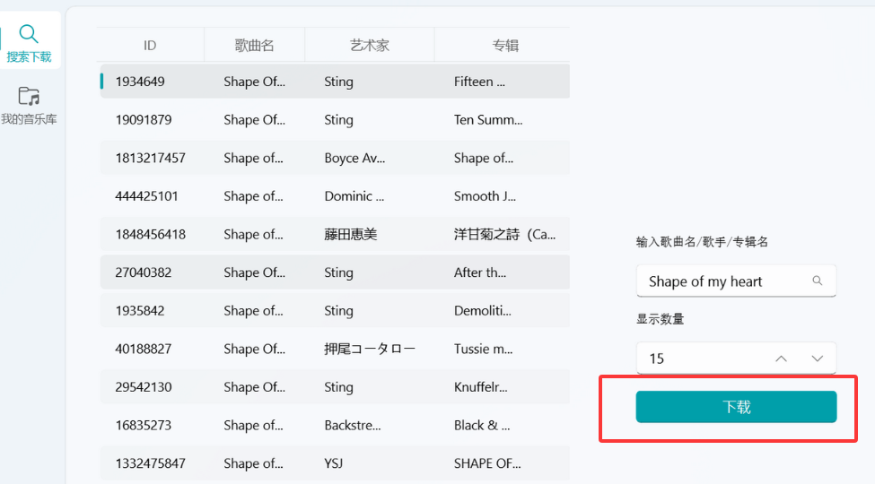 2、输入歌手或者歌曲名字,然后软件会显示对应的歌曲;