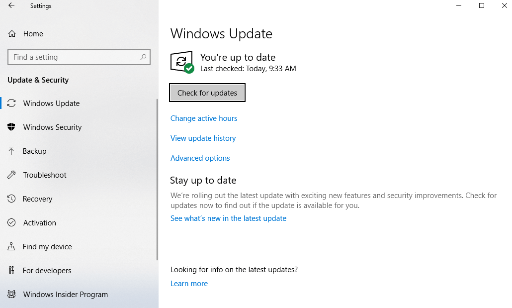 3、进入Windows更新屏幕后,单击“检查更新”按钮。 如果MediaTek通过Windows更新来发送声卡设备驱动程序更新即可。