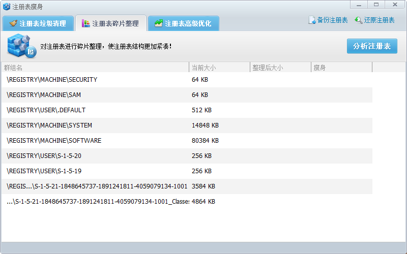 2、点击注册表碎片整理,使注册表结构更加紧凑。