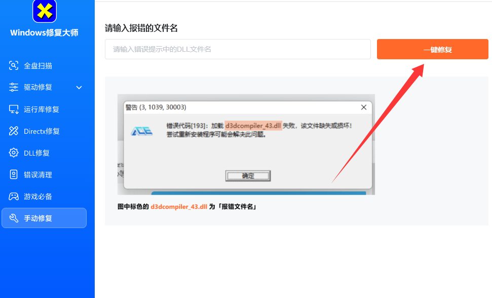 2、扫描结束后开始修复就行了,如果只修复单个dll文件则点击【手动修复】;
