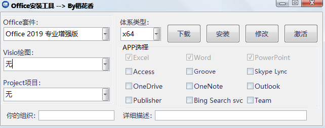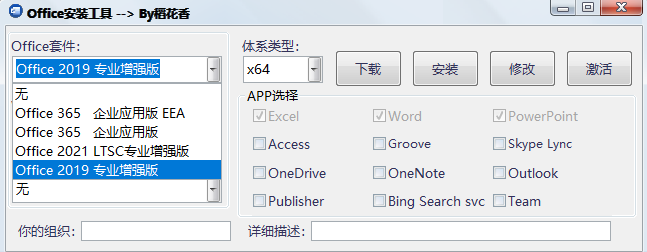 Office安装工具稻花香是一款能安全激活office办公套件的激活软件,在进行激活的使用可以自己选择想激活的版本。并且软件的操作非常简单,用户只需要两步就能完成从安装到激活了,就算是电脑小白也能轻松上手。