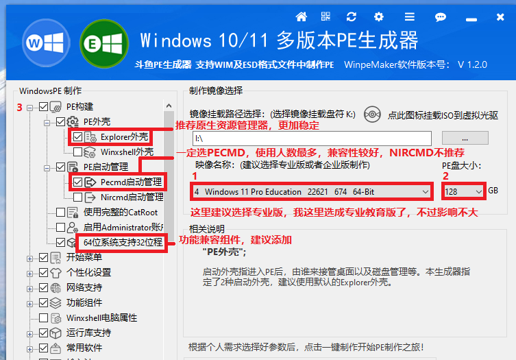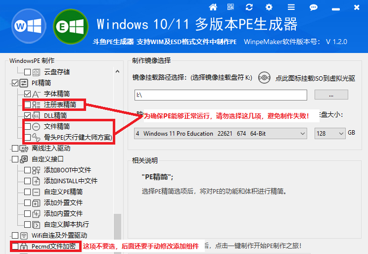 3、直观设计:主界面分为左侧功能选择区和右侧参数配置区,新手可通过默认设置快速生成PE。