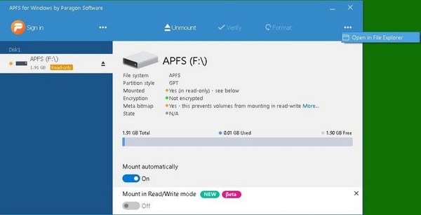 2、直接访问APFS卷:在Windows系统中以读写模式挂载APFS格式的盘,无需转换文件系统。