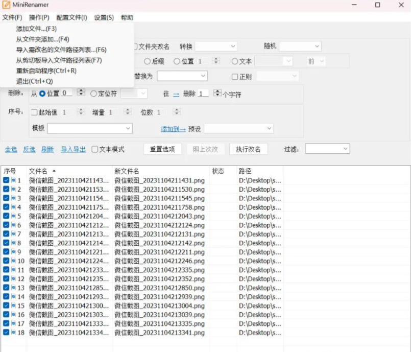 MiniRenamer是一个实用的批量文件重命名工具,提供文本自由改名模式,可灵活输入重命名规则,执行重命名前可实时查看效果,确保是自己想要的名字样式,同时自动排除无法使用的字符,保证文件名符合操作系统要求。