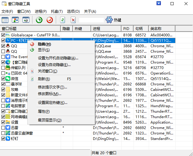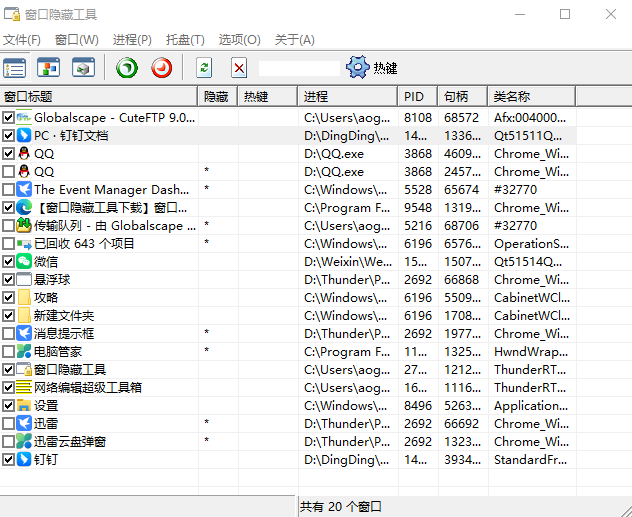 窗口隐藏工具是一款非常好用的电脑系统辅助工具,这款软件能够有效的针对当前所打开的每一个软件的窗口来进行管理,借助其功能是能够实时的进行窗口的处理的,使得电脑运行的时候不会出现卡顿等问题进而提升效率。