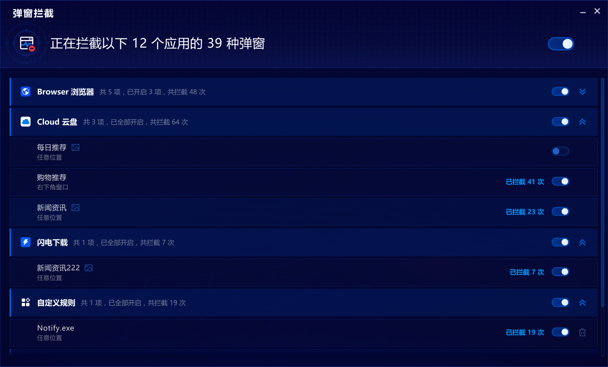 2、弹窗拦截:自动识别并拦截电脑弹窗,用户可手动标记未识别弹窗,实现全网快速响应。