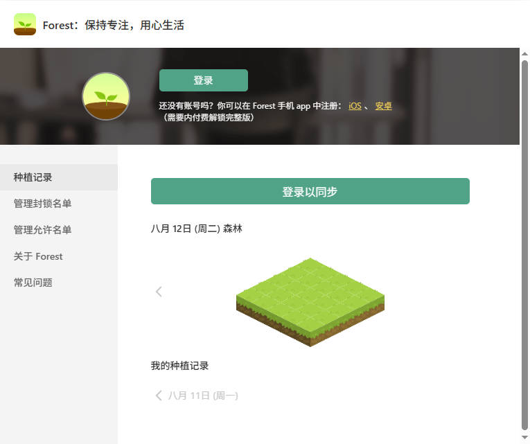 forest插件是一款专注力管理工具,通过种树的方式帮助用户远离手机干扰提升工作效率,用户设置专注时间后开始种树,期间如果使用手机小树就会枯萎,成功完成任务可获得金币奖励,支持多种树种选择和成就系统,适合学生和上班族培养自律习惯,数据可同步至云端多设备使用。