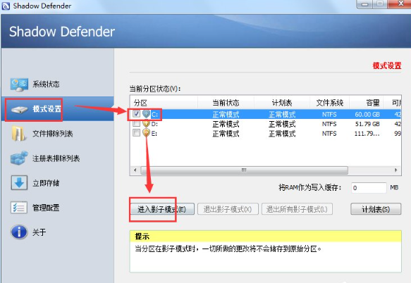 2、选择分区,然后点击【进入影子模式】;