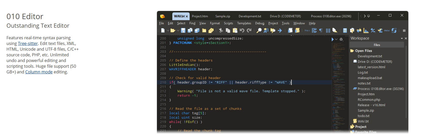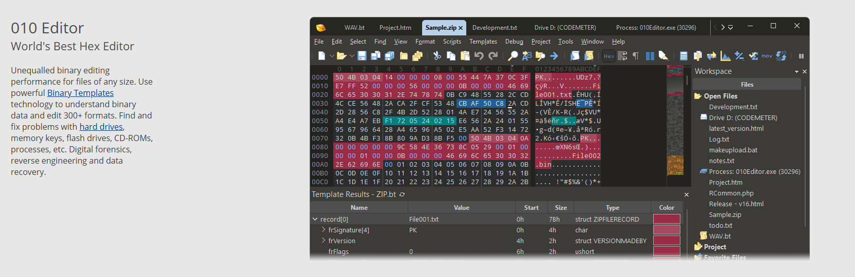 010Editor中文版是一款十分专业的编辑器软件,软件提供多种编辑功能,从十六进制编辑器再到文本编辑器都应有尽有。此外还支持用户使用软件来编辑脚本和文件模板,满足用户的使用需求。软件十分安全,用户能放心使用。