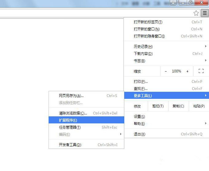 2、启动浏览器后,通过点击右上角菜单栏进入"更多工具"选项,选择"扩展程序"页面。