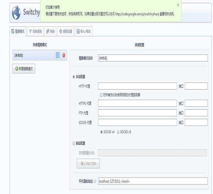 允许同时配置 HTTP、HTTPS、SOCKS4/5 多级节点,通过情景模式命名区分“国内”“国外”“公司内网”,切换逻辑清晰。