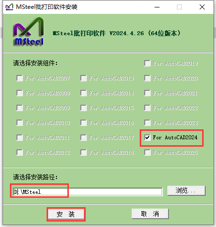 1、首先我们打开软件,勾选上CAD版本,更改安装位置点击【浏览】进去更改。