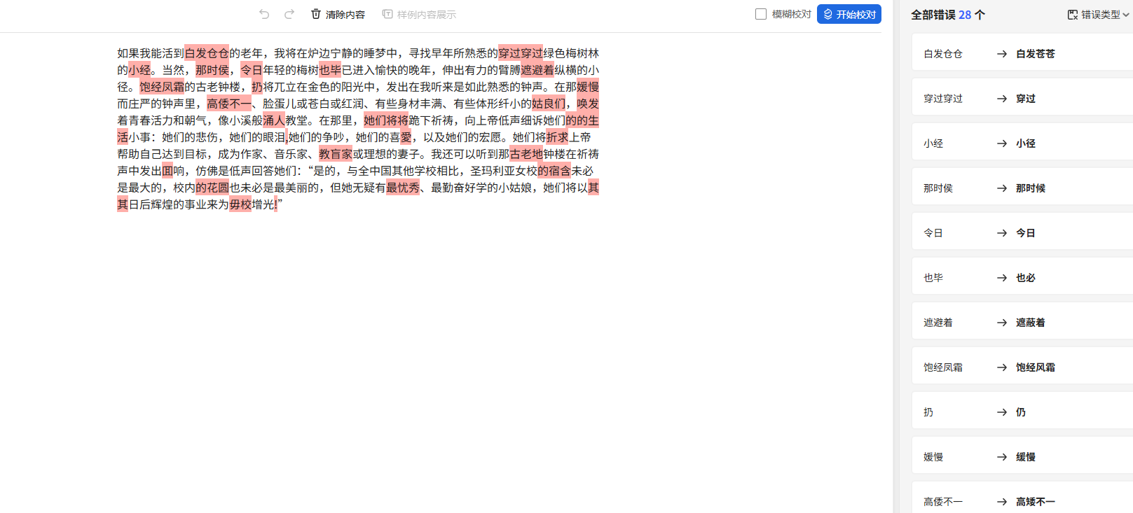 2、添加文章开始校对,软件会将出现的错误都高亮显示;