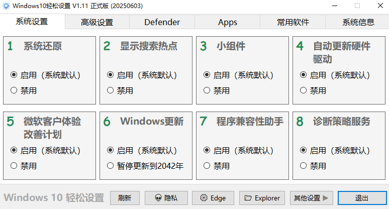 Windows11轻松设置工具软件是一款免费实用的系统设置工具,软件将各种系统设置操作流程都进行了简化,用户只需要选择启用或者禁用就能轻松对系统进行操作了。而且制作者还为用户们整理了一系列常用的软件,方便用户下载使用。