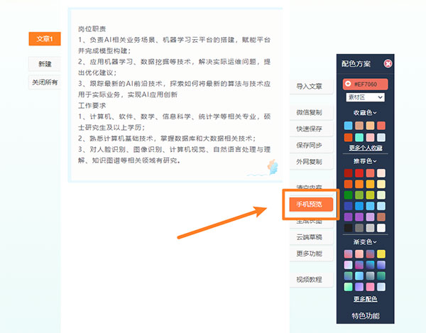 完成文章的排版后,可以使用【手机预览】功能,扫码查看排版在手机上的显示效果。