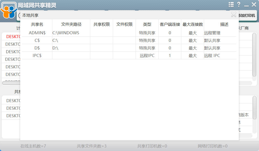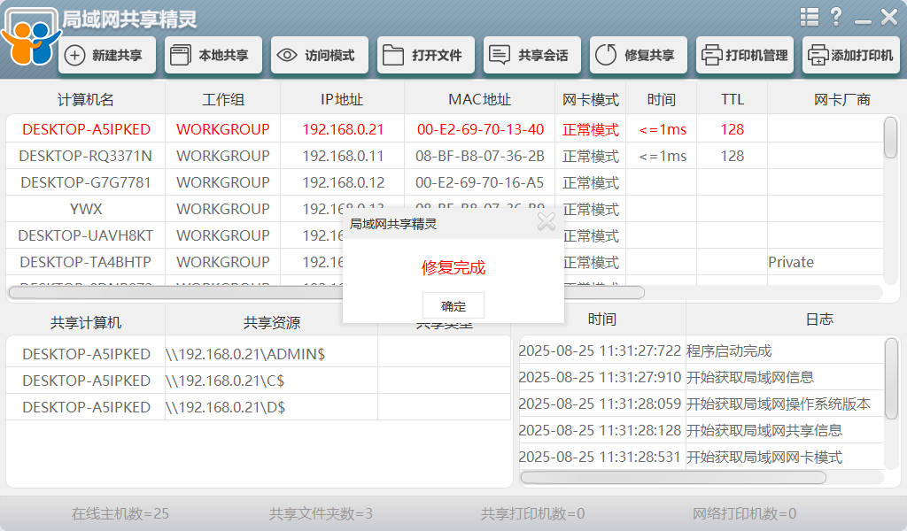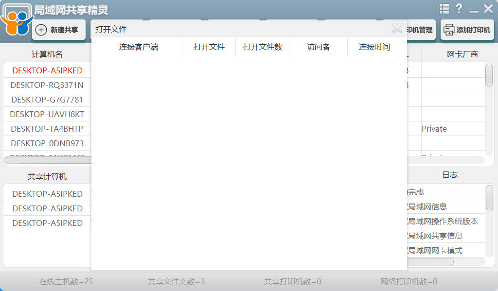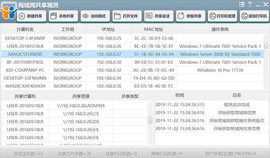局域网共享精灵是一款专业的局域网共享软件,它能帮助用户在Windows系统环境下快速设置和管理文件及打印机的共享,通过一键获取局域网在线计算机、一键共享文件夹和磁盘、一键设置共享打印机等功能,简化局域网内资源共享的操作流程,提升办公或家庭网络环境下的工作效率与便捷性。