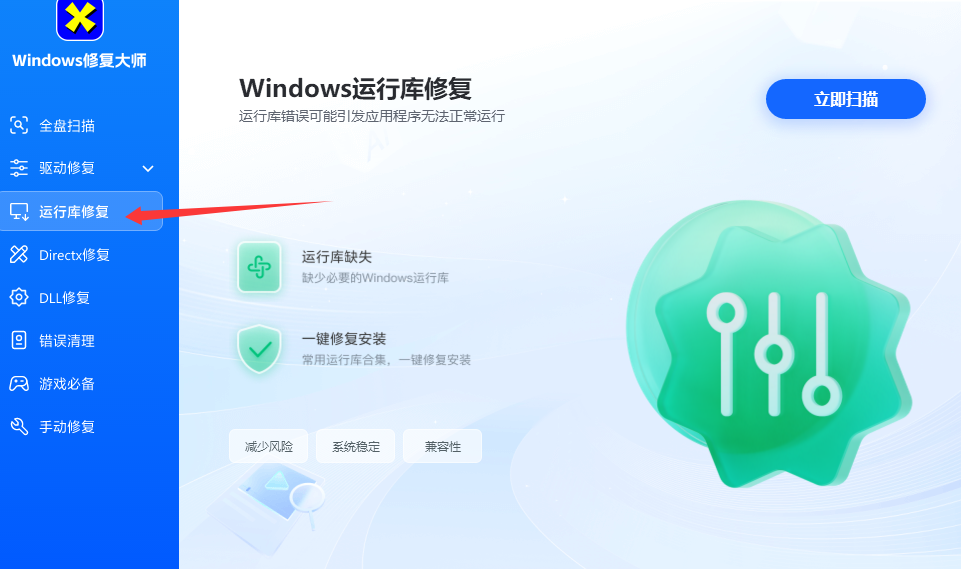 2、然后点击扫描,让软件扫描缺失的运行库;