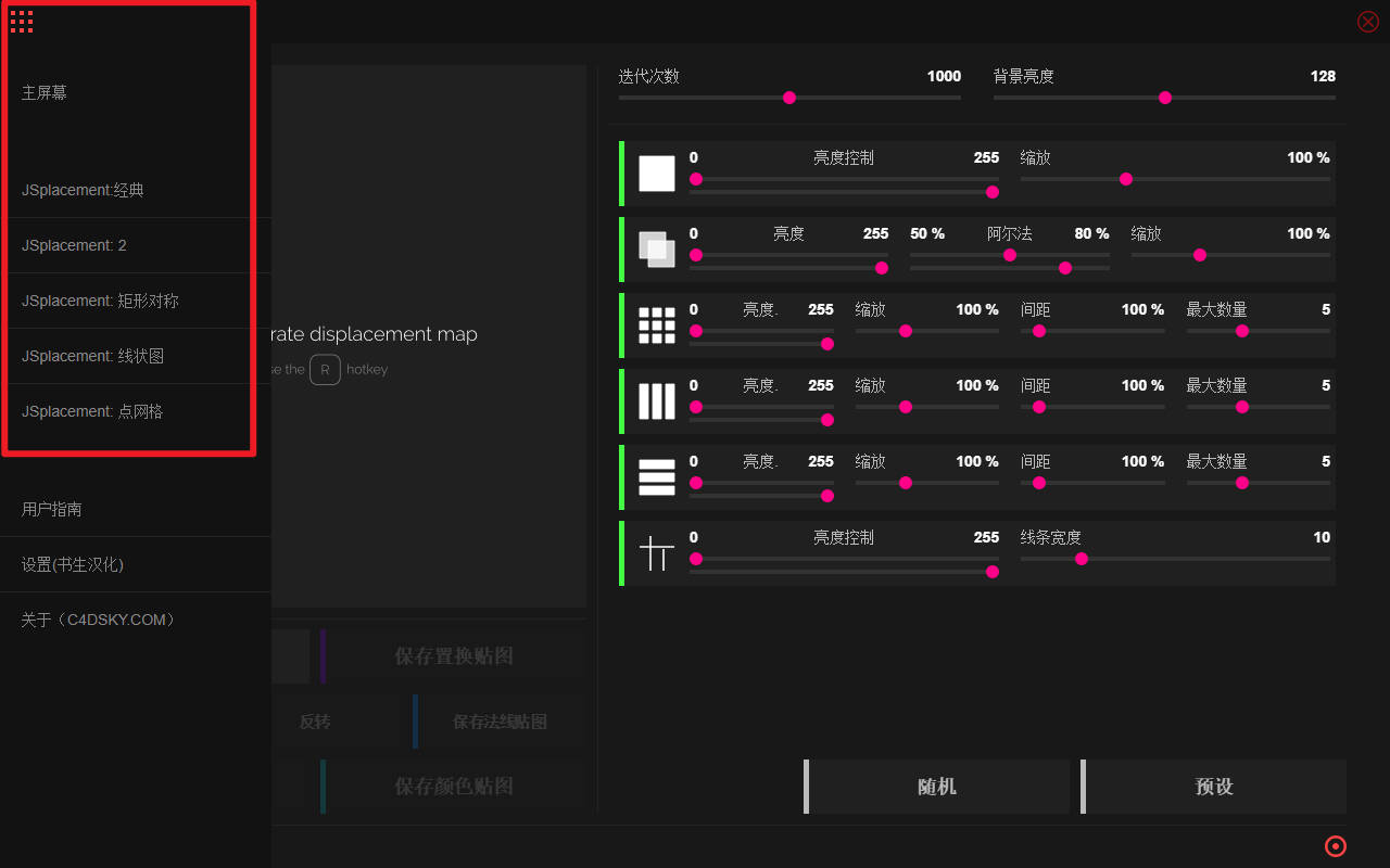 JSplacement是一款专业的8K位移贴图生成软件,它采用HTML和JavaScript技术开发,能够快速生成各种科幻风格的灰度高度贴图,并支持输出8192x8192像素的PNG格式图像,该软件还提供法线贴图导出和自定义精灵功能,广泛适用于三维软件和渲染中的位移置换操作。