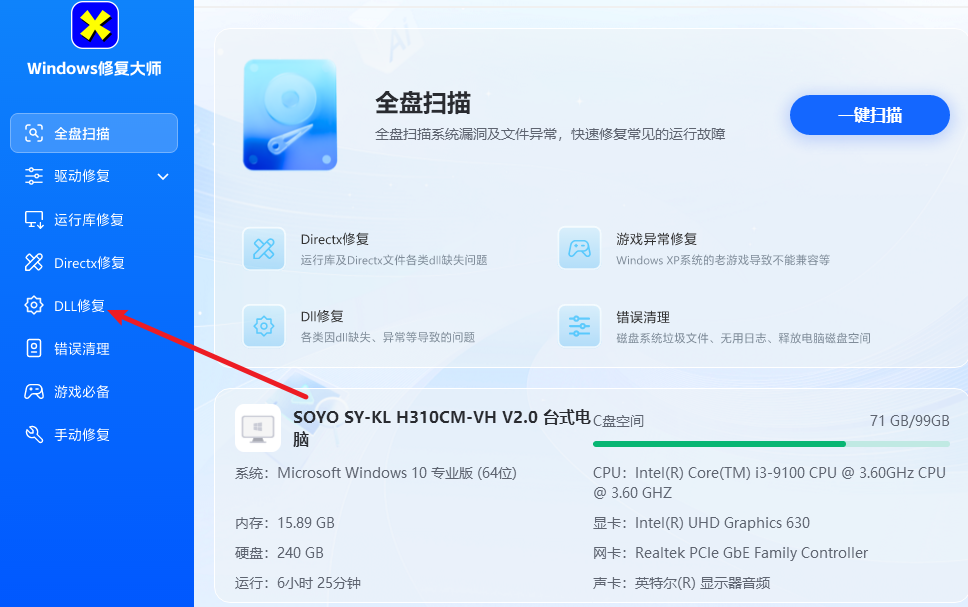 当你的电脑遇到dllL问题的时候,可以在全盘扫描中修复任何的dll缺失问题。