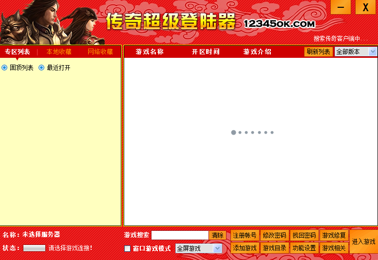 传奇超级登录器红色激情版是一款相当优质的万能的登录器,可以帮助用户更好的对各种不同类型的传奇进行游玩,使用起来非常的简单且方便,是一款相当优质的传奇游戏的软件,有需要的用户快来下载试试吧!