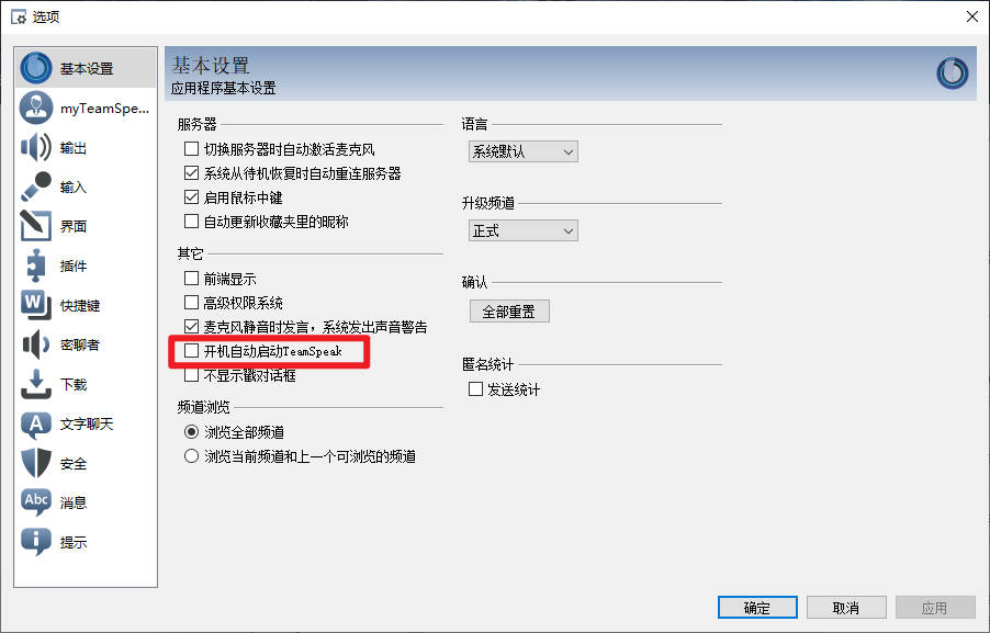 3、勾选开机自动启动TeamSpeak,点击确定即可。
