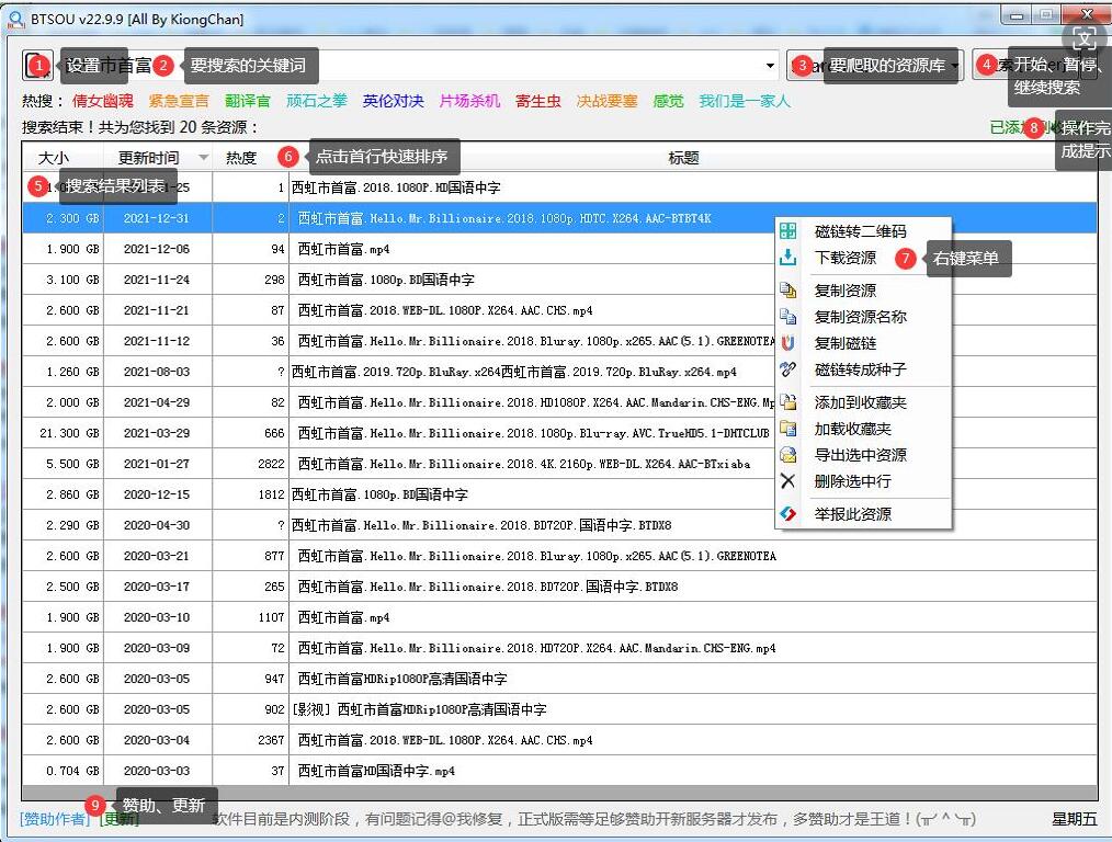 BTSOU电脑版构建了从资源搜索到下载管理的全链路生态,大家可以设置筛选条件,输入资源名字后即可快速搜索,将你想找的链接排在前面,精准满足你的搜索需求,只需右键点击对应的链接,即可进行复制或下载,操作起来十分简单。