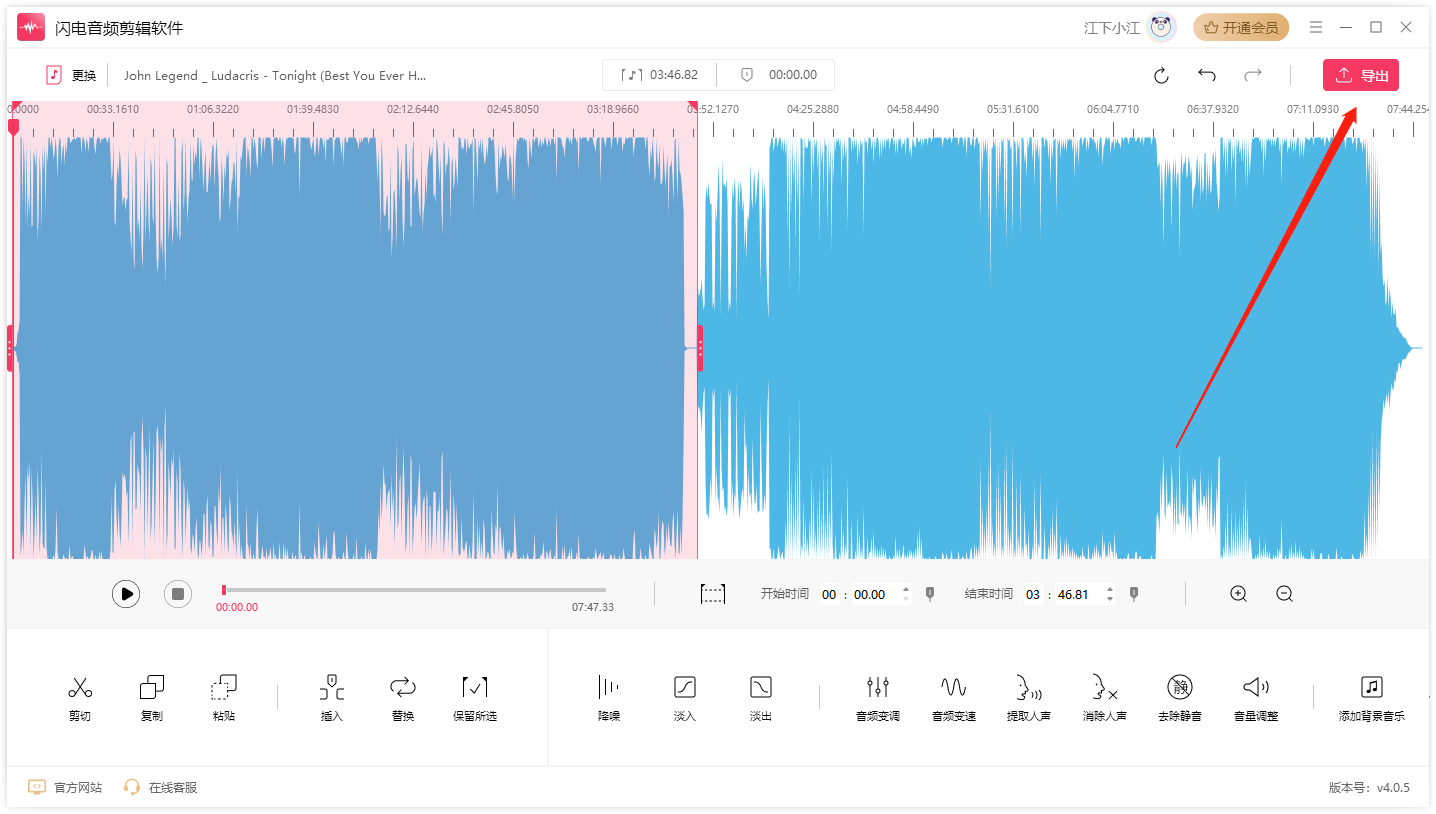 1、导入音频文件后拖动时间轴选取片段,点击裁剪或分割按钮执行操作。