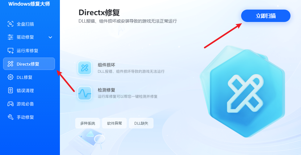 1、在软件左侧选择DirectX修复,接着点击立即扫描。