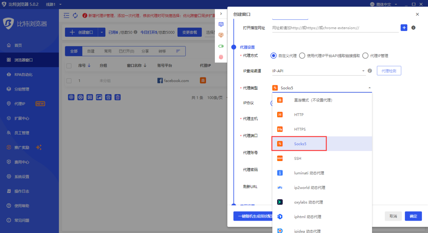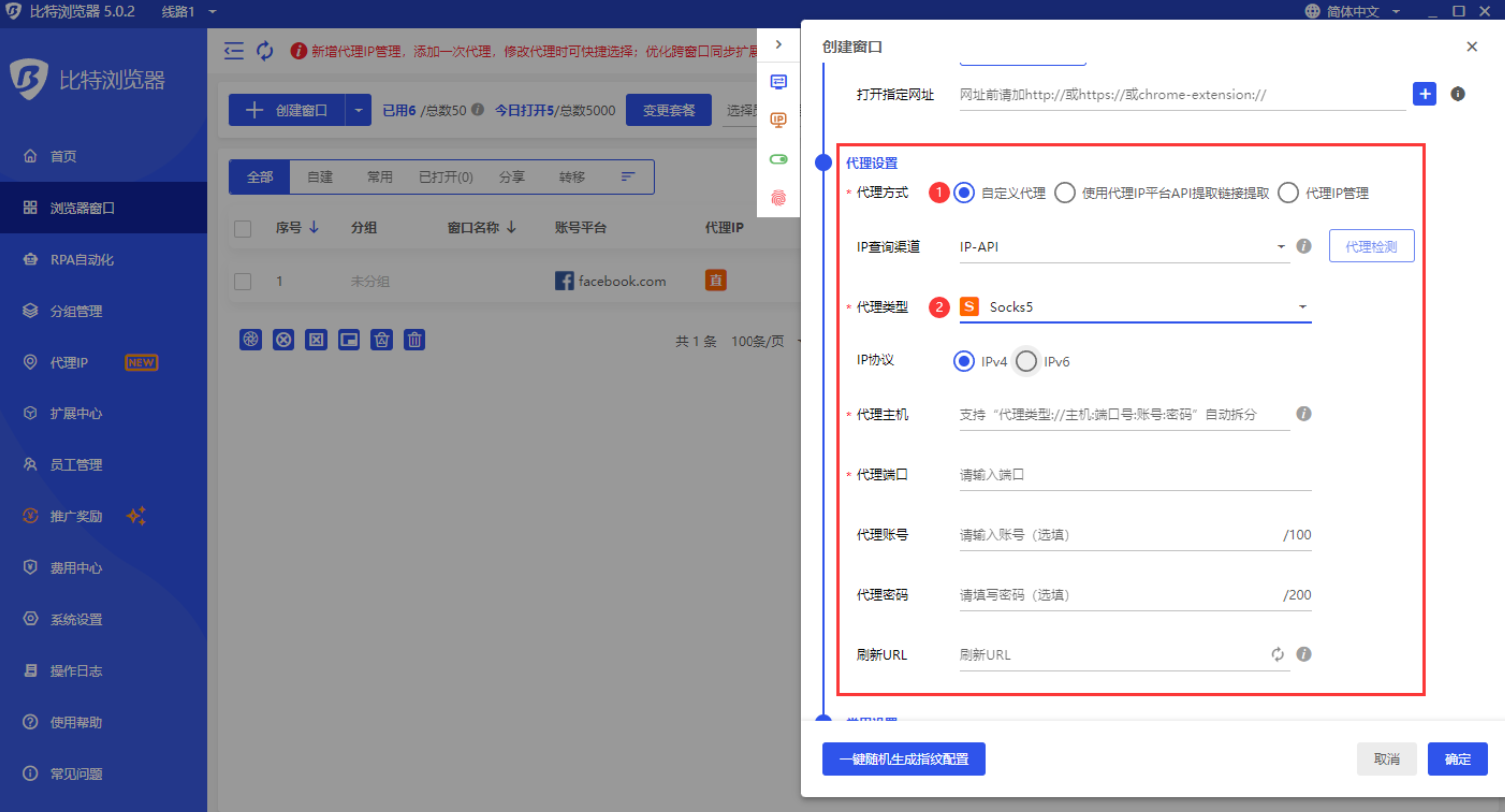 1、在客户端点击左侧菜单项“浏览器窗口”,随后点击“创建窗口”按钮,选择自定义代理。
