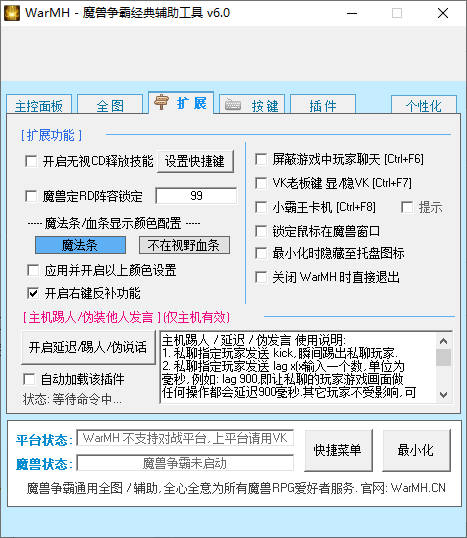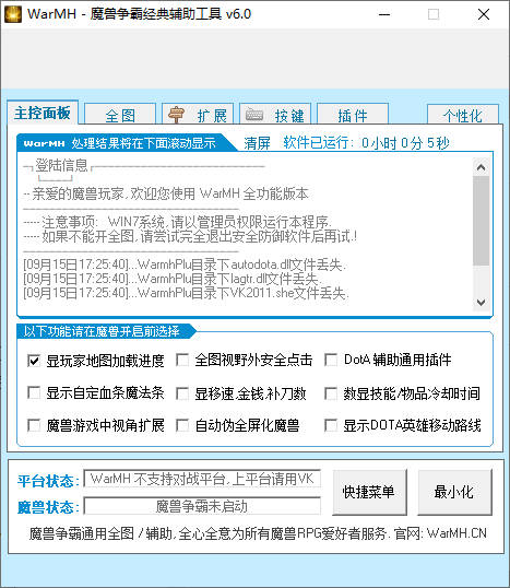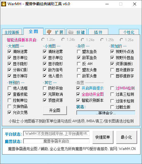 WarMH是一款魔兽争霸的全图及显血辅助软件,具备移除战争迷雾、显示神符位置、提供敌方信号提示等功能,并支持自定义快捷键操作,同时过主流对战平台检测,但暂不支持对战平台使用,目前仅支持游戏本体。