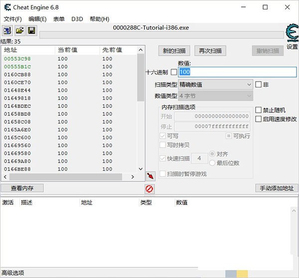 1、启动软件并加载游戏进程输入数值进行扫描,锁定目标地址修改数值。