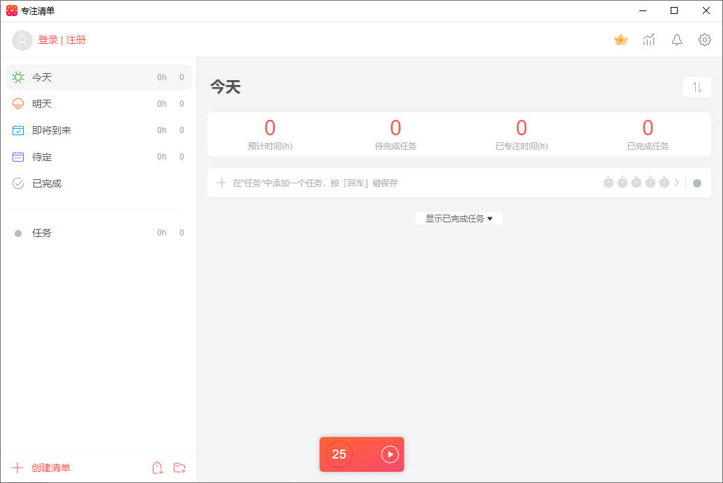 1、输入任务名称设定优先级启用番茄钟专注倒计时,完成任务后自动归档。