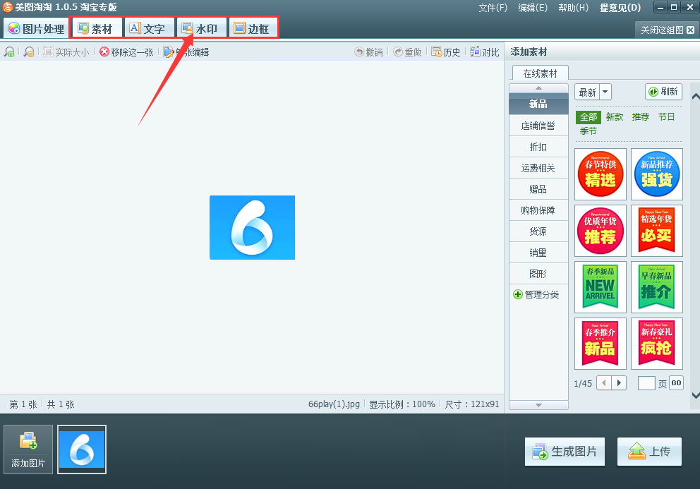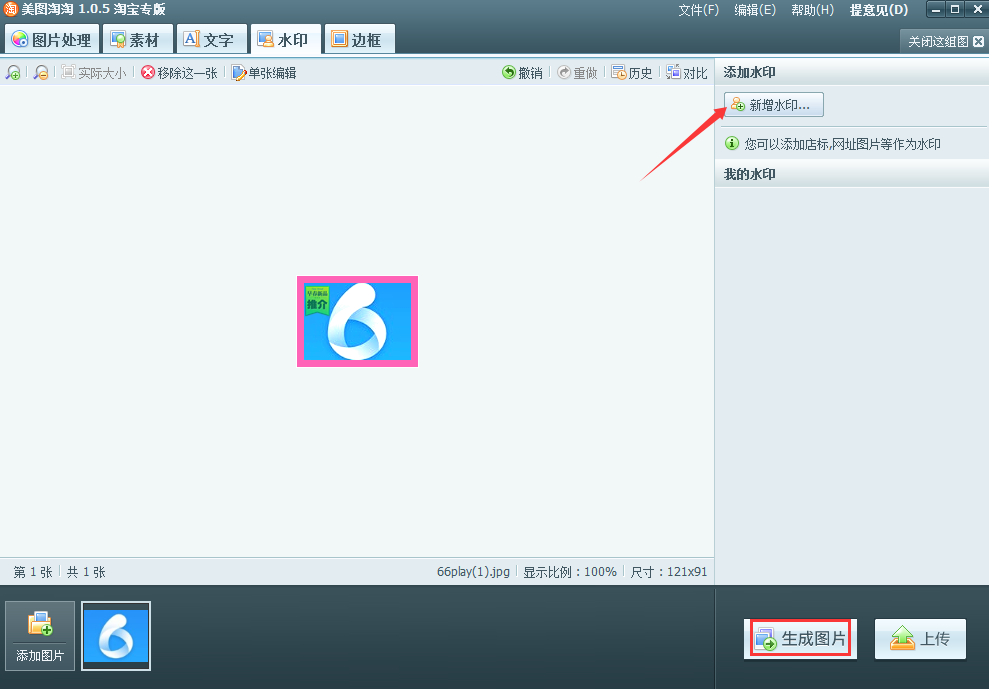 1、进入软件之后上传一张图片然后点击最上面的水印功能。