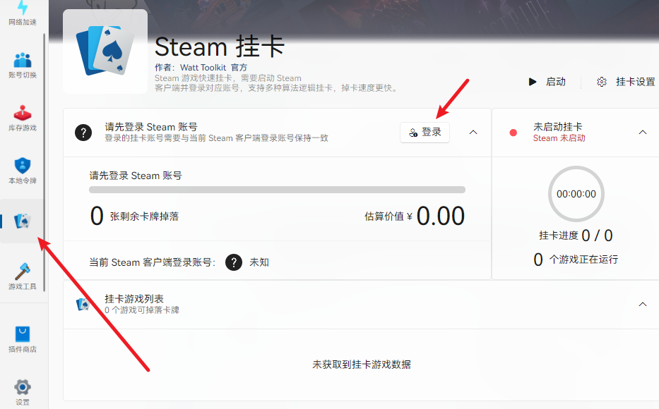 1、打开软件,选择steam挂卡,登录自己的steam账号。