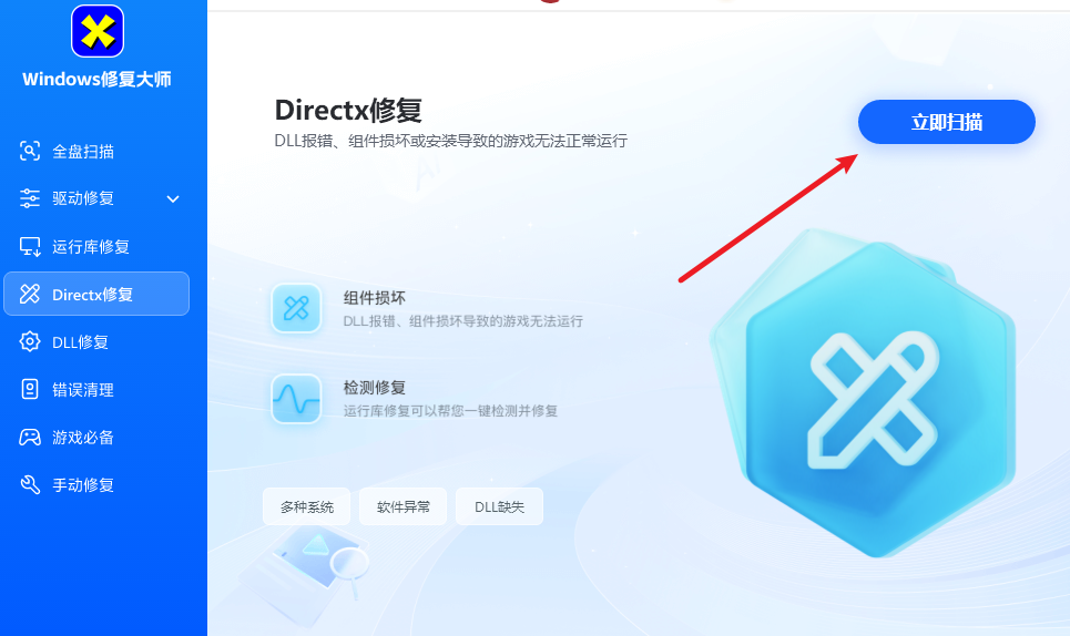 1、打开软件,在左侧选择DirectX修复,随后点击右侧的立即扫描。
