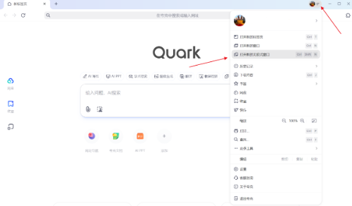 1、打开软件,点击浏览器上方的菜单,选择打开新的无痕模式窗口。
