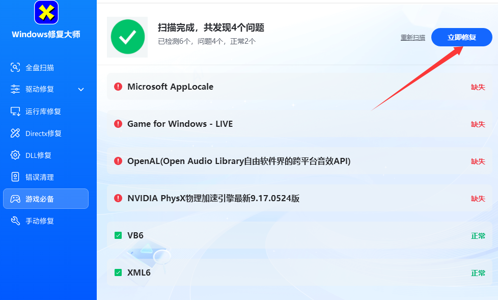 软件当中一旦缺失重要数据文件之后,一键点击就可以自动修复了,用户耐心等待就行。