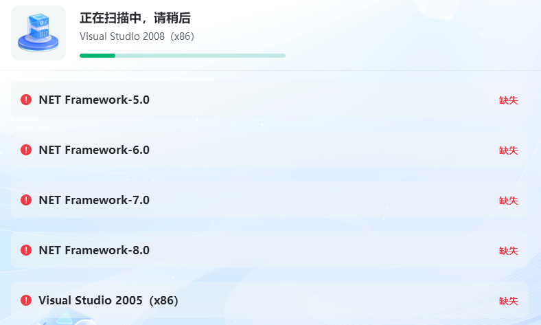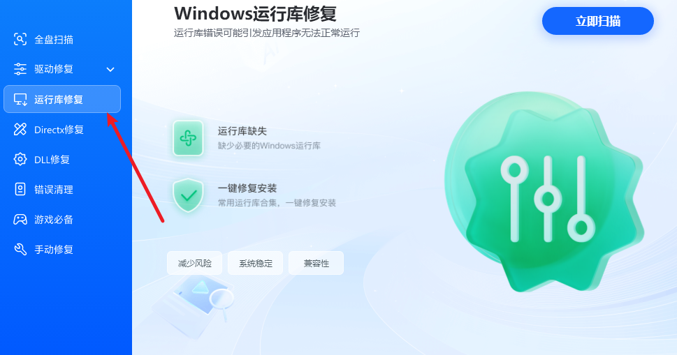 1、首先我们打开软件,点击左侧的运行库修复功能,随后点击立即扫描。