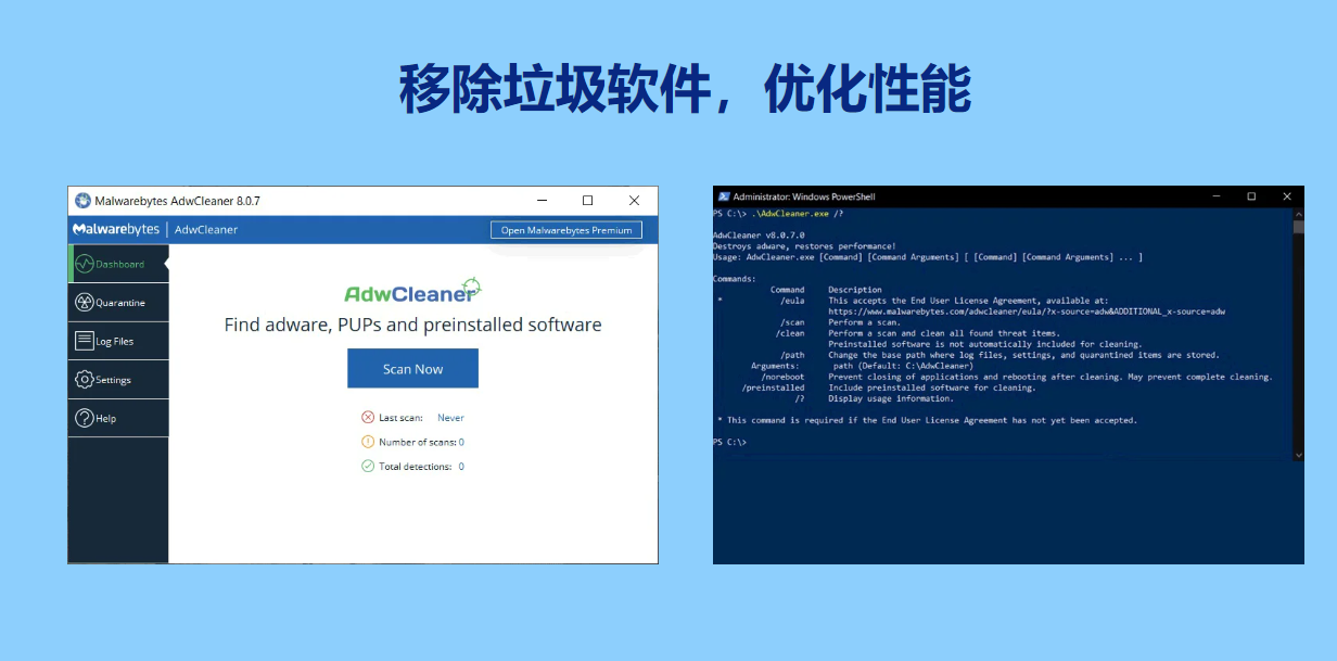 AdwCleaner中文版是一款高效的垃圾清理软件,软件是专门用来清理电脑上的各种垃圾应用和恶意应用的。软件的清理功能十分强大,一次清理就能将所有的数据都删除掉,没有任何卸载残留,释放电脑空间保护电脑安全。