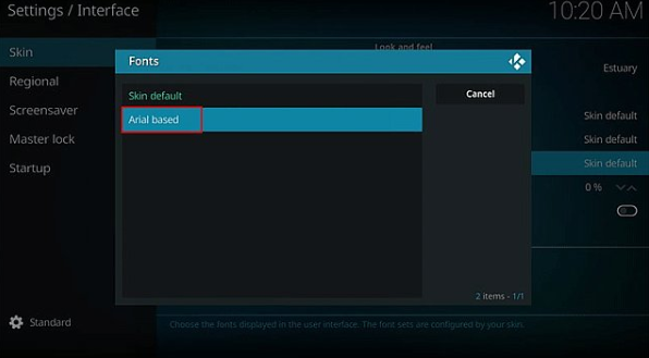 2、点击Interface,选择Skin并点击Fonts,将字体改为Arialbased。