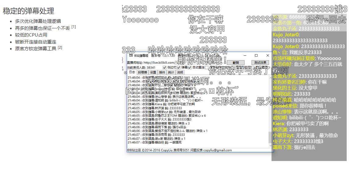 哔哩哔哩弹幕姬是专门为B站直播间打造的直播助手,只要是针对弹幕这一块开发的,观众们的评论会放大变成弹幕从你屏幕上飘过,主播可以自定义弹幕大小、移速和显示时长,这样就可以清除看到每一位粉丝的留言了。