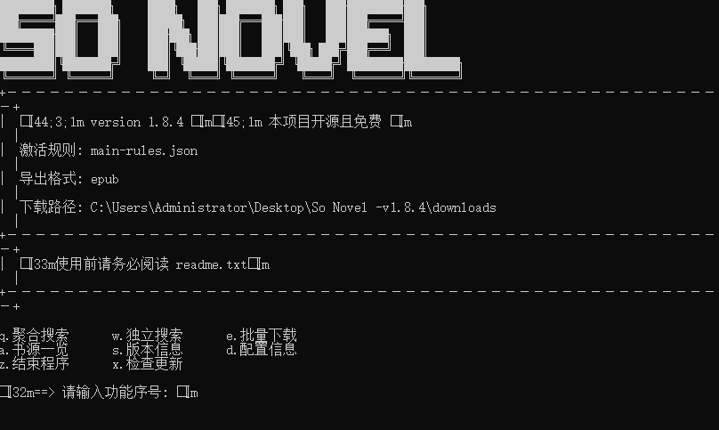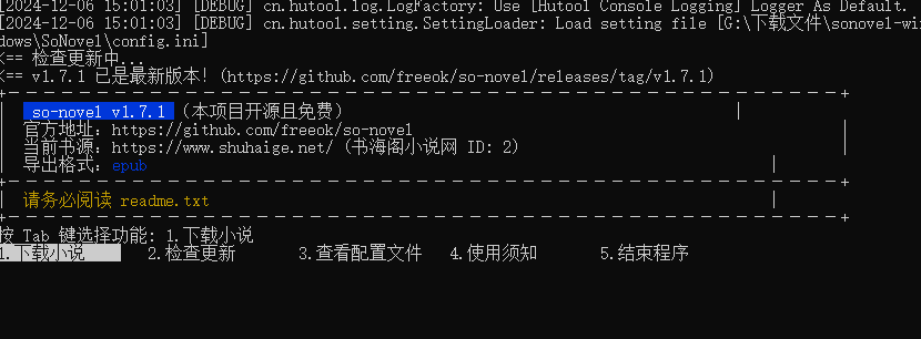 1、打开软件,按下Tab件选择对应的功能,我们选择下载小说后按下回车。