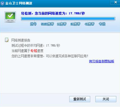 金山卫士网络测速器是一款轻量便捷的网速测试软件,软件只为用户提供网络速度测试这一个功能。软件会将每秒的网络速度数据都显示出来方便用户了解,而且还支持用户将数据复制到剪贴板上,全方面满足需求。