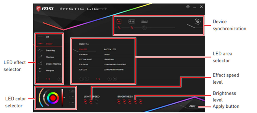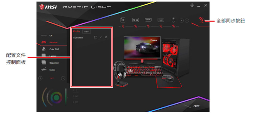MSI Mystic Light是一款可以让用户对微星的RGB灯效进行控制和管理的工具,可以轻松控制各种硬件和外设的RGB灯效,操作起来非常的方便,可以轻松满足各种不同情况下的使用需要,带来了非常优质且实用的灯效管理效果。