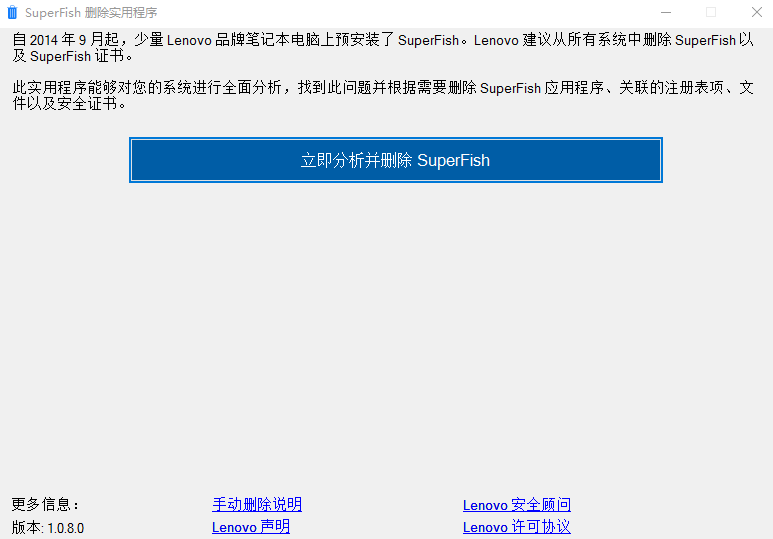 2、单一功能:软件只为用户提供分析和删除superfish软件的功能,无其他冗余功能。