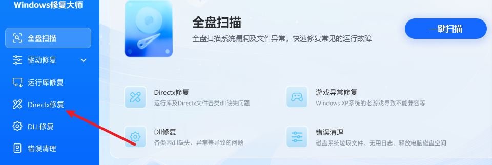 1、打开软件,点击左侧菜单中的DirectX修复。