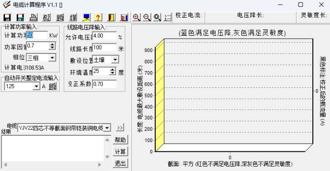 1、输入电流、电压及电缆长度,选择导体材质与截面积点击计算载流量。