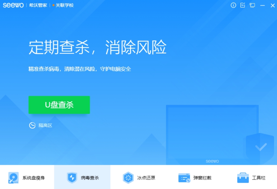 集成病毒查杀与冰点还原主动防御恶意入侵,一键重启快速恢复系统安全状态。